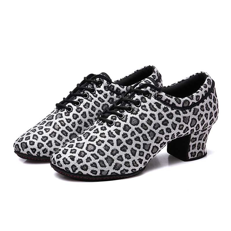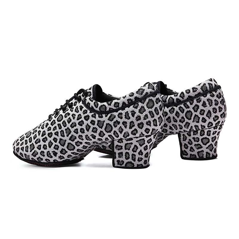 Highlights [Fabric] : Crafted with high-quality tulle, these women's dance shoes offer a textured and durable surface, perfect for enhancing both style and function on the dance floor. The suede outsole provides excellent grip, allowing for smooth and confident moves. [Fit] : These shoes feature a lace-up closure for a secure, adjustable fit, ensuring comfort during long practice sessions and performances. The round toe design offers ample room for movement and flexibility, crucial for various dance styles. [Design Highlights] : Showcasing a chic leopard print and a thick heel, these shoes boast a bold, stylish look. The attention-grabbing pattern adds a fashionable edge, while the moderately high heel, standing at 1.38 inches (3.5 cm), balances aesthetics with comfort, making these shoes a standout choice for dancers. [Occasions] : Ideal for indoor Latin and line dancing, these shoes are suited to practice, training, and performance settings. Whether you're perfecting steps in a class or shining on stage during a ChaCha routine, these shoes provide the support and style needed for various dance occasions. [Size Information] : Available in a range of sizes from 36 to 41, these dance shoes are designed for adult women. Choose your regular size for the best fit and enhanced performance.