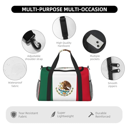• Pocket Layout: Flag of Mexico print Weekender Bags for Women has one main pocket with double-headed zippers for easy access. An internal zip pocket, adjustable strap (70 - 120cm), 65cm handles, side mesh and reinforced webbing with buckle, offering organized storage.