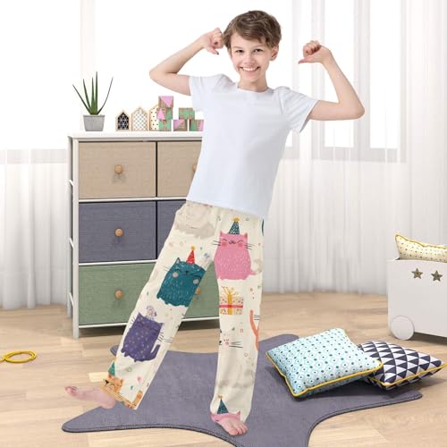 Birthday Cat Print Boys Long Pants Soft Trousers Elastic Waist Kids Lounge Bottoms with Pockets S-XL 6