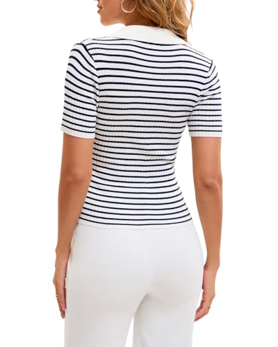Cioatin Women Short Sleeve Striped Knit Polo Crop Shirt Tops Vintage Collar V Neck Slim Fit T-Shirt Aesthetic Going Out 1