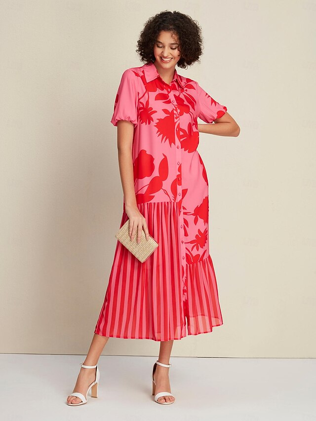 Chiffon&Satin Rose Red Floral Stripe Asymetric Hem Short Sleeve Maxi Dress 1