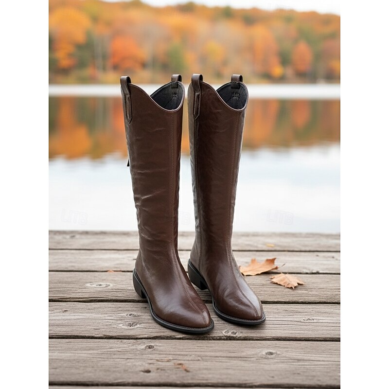 Women's Knee-high Riding Boots with Pull Tabs, Low Heel Comfortable Slip-On Design, Classic Western Inspired Style Fashion Shoes for Urban Casual Wear 1