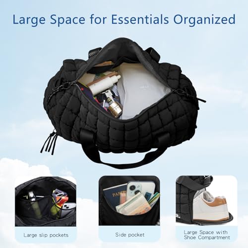 • Quilted Gym Bag:This quilted puffer bag features a spacious main compartment and separate shoe pocket for convenient gym or travel use.Combining fashion and functionality, while easily carrying all essential items.Dimensions:18.5×8.26×16.75 inches.Suitable for gym bag, gym sport bag, duffle bag, travel duffel bag, travel holdall bag, gym holdall, overnight bag, weekender bag, travel bag