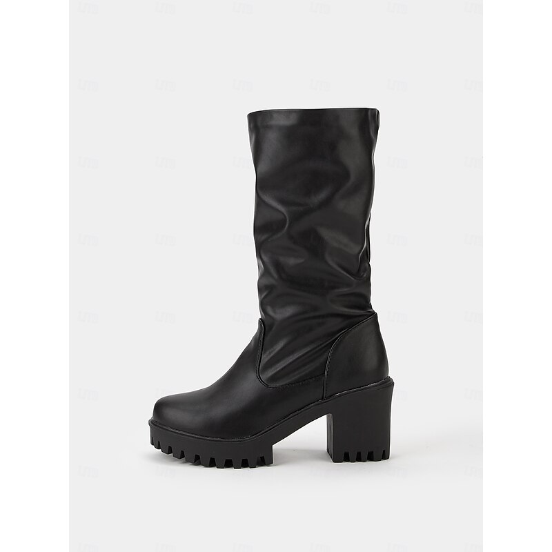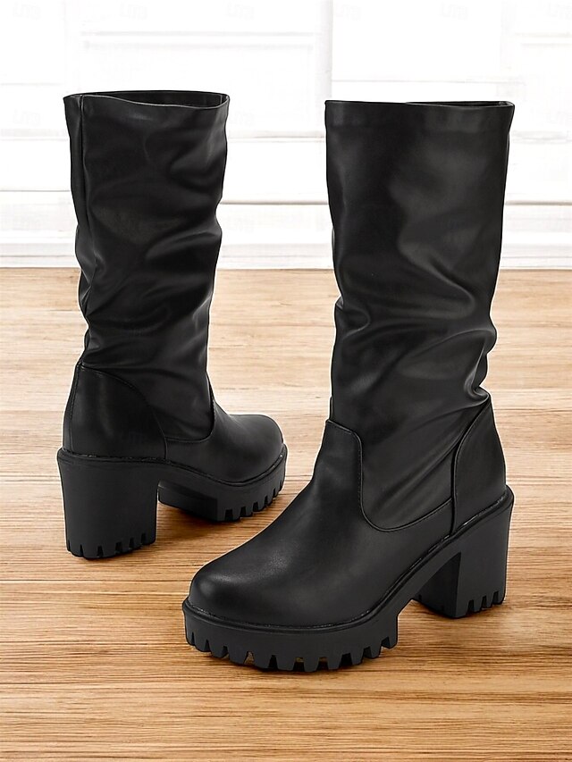 Highlights [Fabric] : Crafted from premium PU material, these women's black boots boast a sleek finish that mimics genuine leather, offering durability alongside style. The high-quality synthetic leather ensures the boots withstand various weather conditions, making them a reliable choice for fall and winter wear. [Silhouette] : Featuring a mid-calf height with a sturdy block heel, these boots provide both warmth and an effortlessly chic look. The chunky heel and lug sole deliver a bold appearance while providing ample stability and comfort for all-day wear. [Design Highlights] : These boots showcase a minimalist, slouchy design with a round toe that complements a variety of outfits. The ridged sole enhances grip and traction, making them suitable for diverse terrains and adding a modern twist to the classic boot style. [Occasions] : Perfect for daily wear during cooler months, these versatile boots are suitable for casual outings or dressed-up occasions. Pair them with jeans for a relaxed look or a skirt for a more polished ensemble, making them a must-have addition to any seasonal wardrobe. [Size Notice] : Available in a range of sizes from US5.5 to US10.5, these boots follow standard sizing. It is recommended to select your usual size for the best fit.