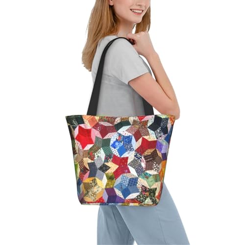 Wonky Star Quilt Fashionable Tote Bag - Durable Reusable Shopping Shoulder Bag With Zipper Pockets, Washable Market Bag For Travel & Beach 5