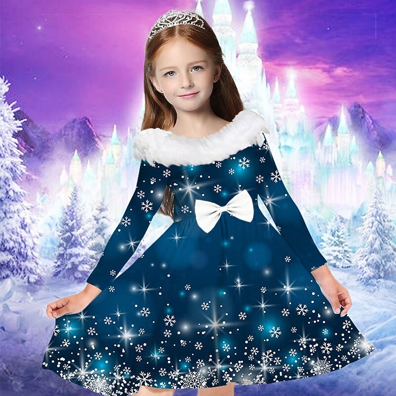 More information about Kids Girls' Dress Snowflake Long Sleeve Casual Fur Trim Crewneck Adorable Daily Polyester Above Knee Casual Dress Swing Dress A Line Dress Fall Winter 2-13 Years Navy Blue Blue Sky Blue