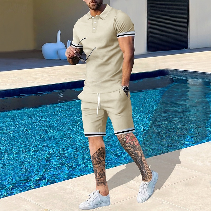 More information about Men's T-shirt Suits 2 Pieces Outfits Tee & Shorts Short Sleeve Lapel Summer Plain Fashion Casual 2 Piece Vacation Daily Wear Going out Black White Navy Blue Top Tee for Men