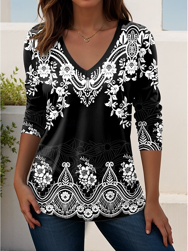More information about Women's T shirt Long Sleeve V Neck Long Sleeve Tunic Graphic Plants Vintage Elegant Bohemia Vintage Regular Tops Daily Going out Weekend Print Black White Pink Dusty Rose Red Spring Fall Prefall