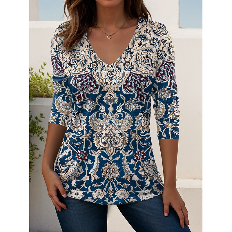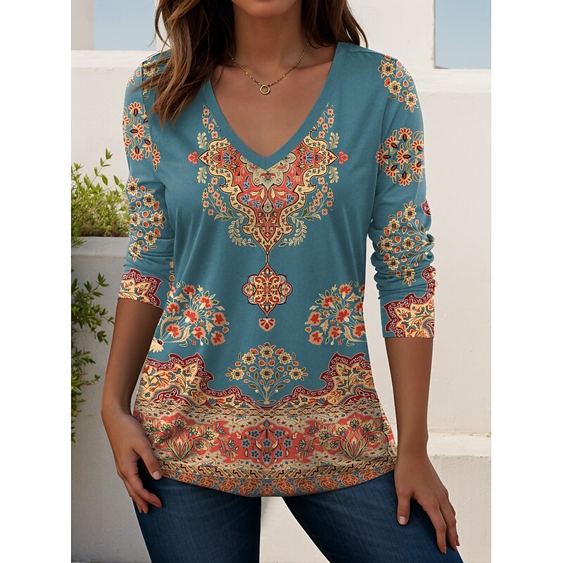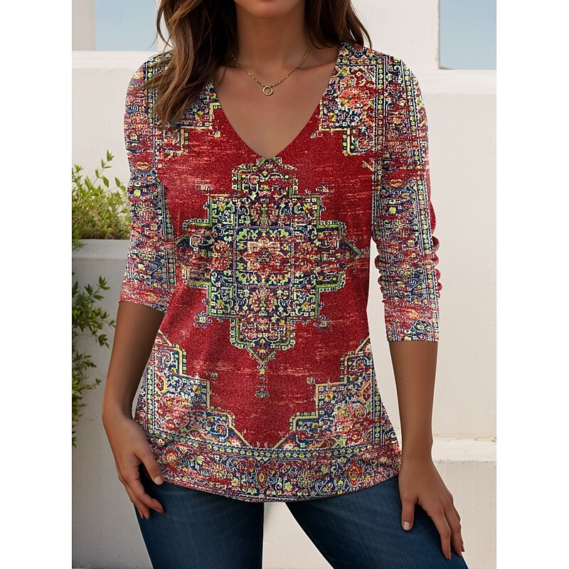 Women's T shirt Long Sleeve V Neck Long Sleeve Tunic Graphic Plants Vintage Elegant Bohemia Vintage Regular Tops Daily Going out Weekend Print Black White Pink Dusty Rose Red Spring Fall Prefall 25