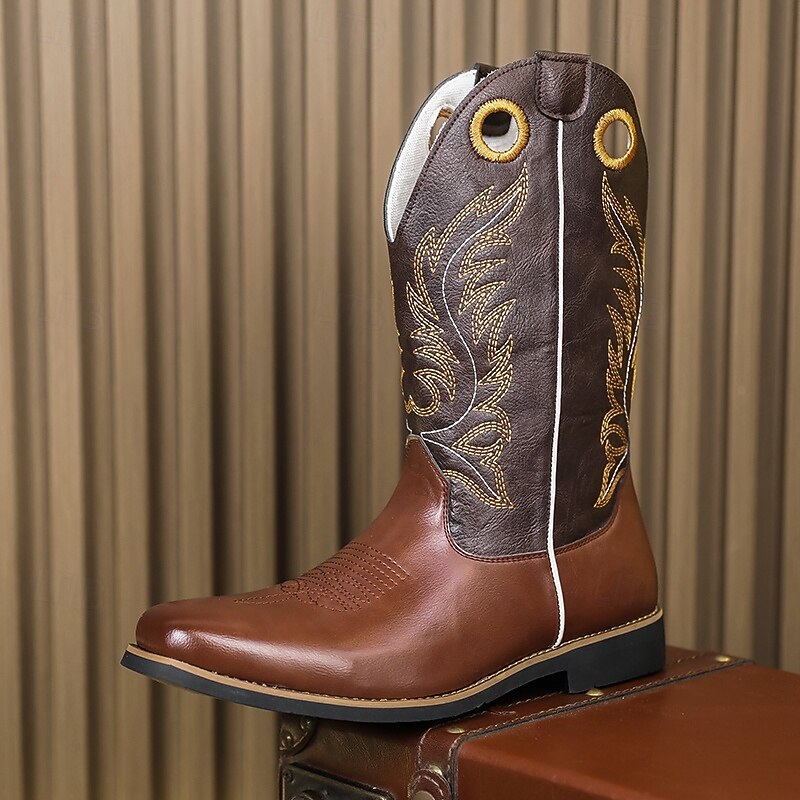 HOT ! Men's Brown and Black Western Cowboy Boots – Embroidered Tall Riding Boots for Country Events, Rodeos and Music Festivals