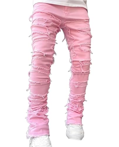 HOT ! Mens Stacked Jeans Straight Leg Y2K Casual Hip Hop Slim Fit Ripped Jeans Fashion Cool Destroyed Streetwear Denim Pants