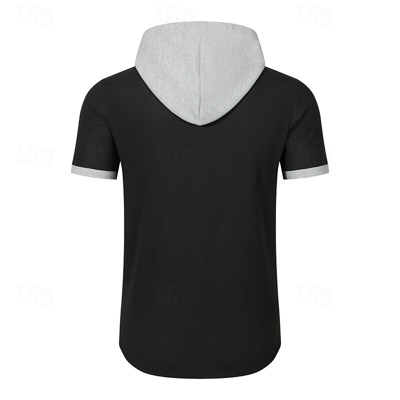 Highlights - Stay cool and comfortable all summer long in this men's polyester short sleeve hoodie - Versatile and casual style perfect for vacation or any casual outing - Trendy color block pattern adds a touch of modern flair - Hooded neckline for added style and functionality.