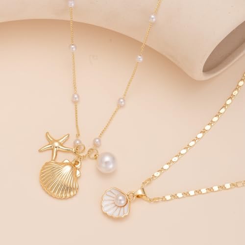 Shell Necklaces for Women 14k Gold Plated Layered Starfish Conch SeaShell Pearl Pendant Charm Necklace Adjustable Stainless Steel Chain Summer Beach Jewelry 5