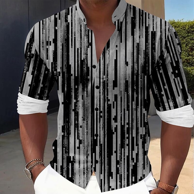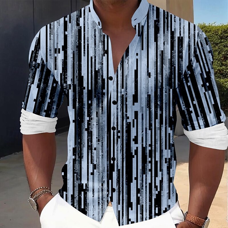 More information about Men's Striped Geometric Pattern Dress Shirt Button Up Shirt Long Sleeve Casual Vacation Daily Summer Spring & Fall Grandad Collar Band Collar 3D Print Blue Green Khaki Black-white Gray