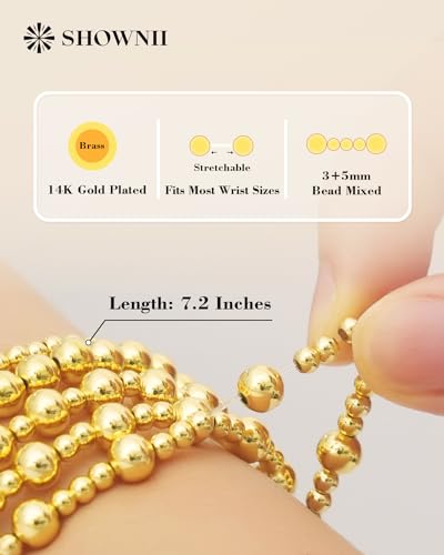 • Stretch Stackable Bracelets for Women:Crafted with a durable and flexible elastic band, this women gold bracelet features two sizes of gold beads (3mm+5mm) for a unique look. Dainty gold bracelet set for women include 5pcs, can be worn alone or stacked according to your outfit or other jewelry. Length about 7.2 inches , fits most wrist sizes.