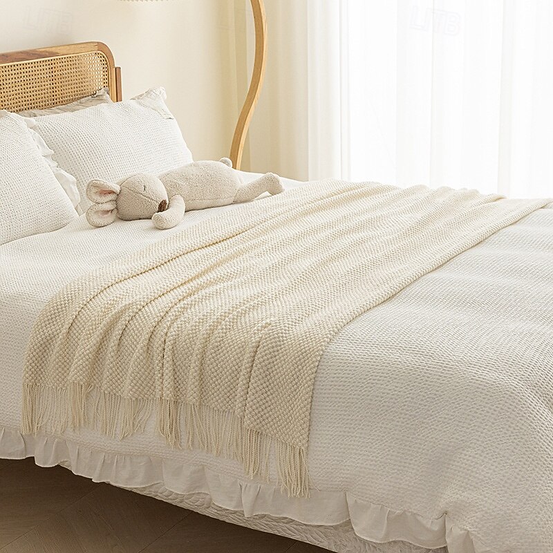 Highlights [Fabric & Material] Crafted from high-quality polyester, this throw blanket offers a soft and cozy feel, perfect for year-round comfort. The material ensures both warmth and durability, making it an essential addition to any living space. [Design & Pattern] The blanket features a solid color design with a textured knit pattern that enhances its plush feel and visual appeal. The delicate fringed edges add a classic touch, creating a timeless and elegant look. [Style & Fit] This knit throw blanket is designed to be both stylish and versatile, seamlessly complementing both modern and traditional home decor styles. It offers a lightweight yet warm layer, ideal for spring and fall seasons. [Occasions & Usage] Suitable for various settings, this throw blanket can be used for cozy evenings on the couch, adding warmth to your bedroom, or as a stylish accent piece for your sofa. It also makes a thoughtful gift for girls and boys. [Size Options] Available in multiple sizes to suit different needs, including 127cm x 230cm, 70cm x 230cm, 127cm x 170cm, 127cm x 260cm, and 70cm x 260cm, ensuring a perfect fit for any bed or sofa.
