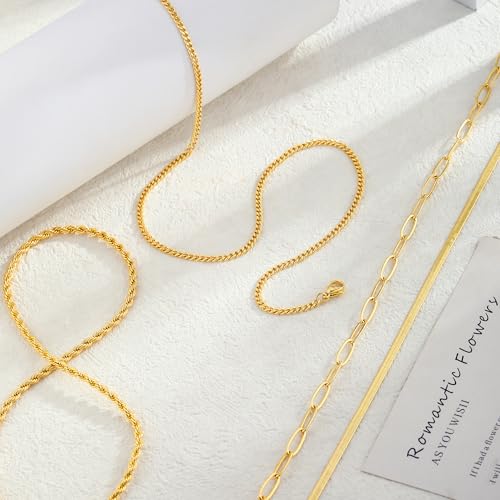 • ✦Layered Gold Necklaces Set✦The daity layered gold necklaces includes 4 chains gold rope chain cuban link herringbone snake chain paperclip chain necklaces.These gold necklaces stack are versatile and looks great with both casual and formal wear,and you can wear either single or stacked to match different styles of clothing. This gleaming elegant layering gold necklaces for women will give you a stunning and delicate look and perfect for adding a touch of elegance to any outfit