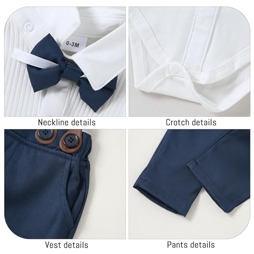 • MATERIAL: The baby boy suits is made of High quality cotton blend fabric , soft, breathable and skin friendly. The top with removable bowtie and buttons at the bottom of the shirt for easy diaper changes, practical and convenient.
