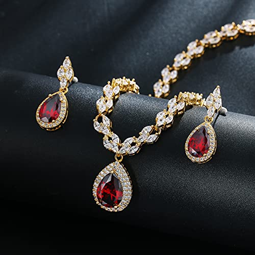 HOT ! WeimanJewelry White Gold/Gold Plated Women Cubic Zirconia CZ Marquise Teardrop Bridal Tennis Necklace and Drop Earring Set for Wedding Brides (Gold tone-ruby cz)