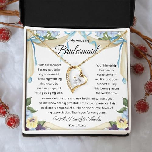• Meaningful Gift: The "Thank You For Being My Bridesmaid" necklace is not just a piece of jewelry but a meaningful keepsake that symbolizes your appreciation and love. By giving this necklace, you are creating a lasting memory of your wedding day and the bond you share with your bridesmaids.