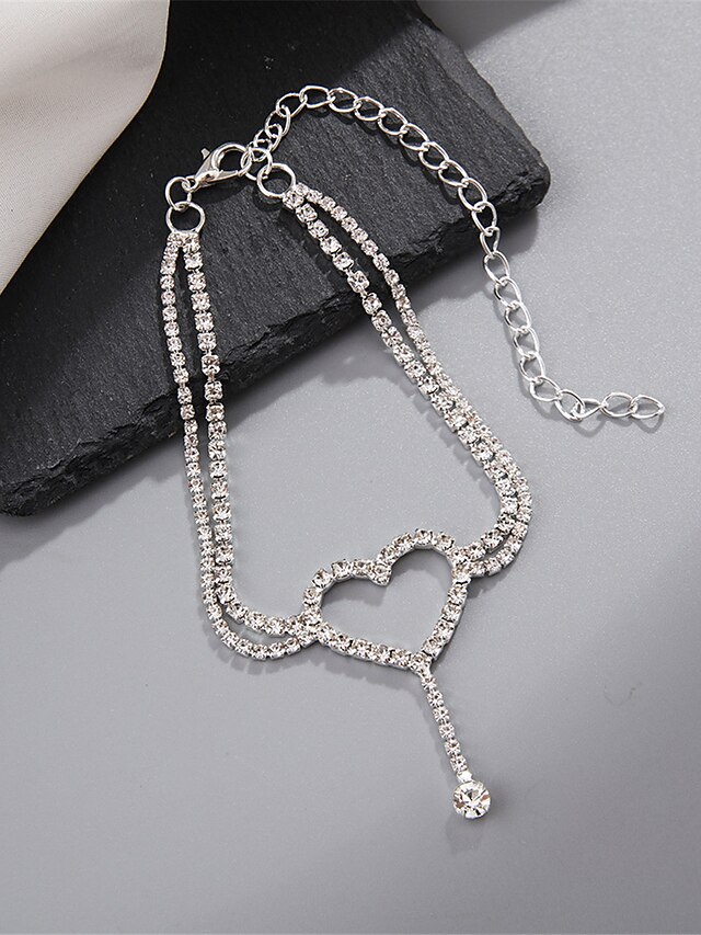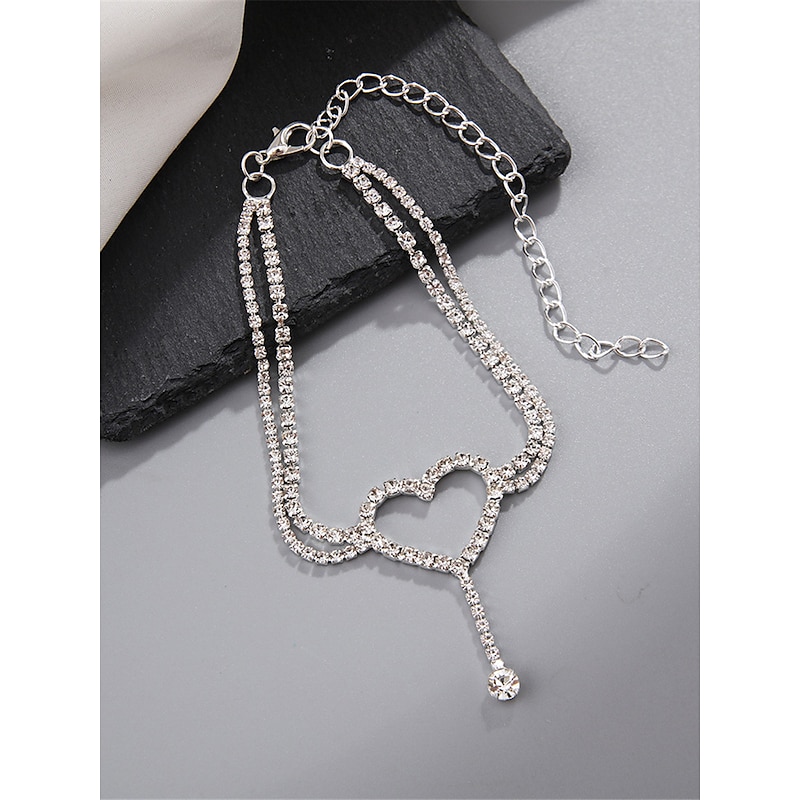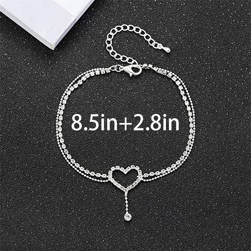 : The anklet showcases a dazzling double-strand design adorned with sparkling rhinestones, making it a true statement piece. At its core is an elegant heart-shaped centerpiece, also encrusted with rhinestones, complemented by a delicate drop pendant that adds additional charm and movement.