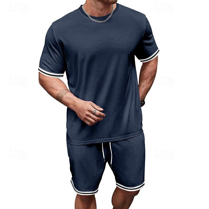 Highlights Men's Two-Piece Set Highlights Highlights [Fabric] Crafted from a high-quality polyester fabric, this men's two-piece set is designed for ultimate comfort during the summer months. The material is soft and breathable, ensuring a comfortable fit throughout the day. [Fit] The T-shirt features a crew neck and short sleeves, offering a relaxed fit that allows for easy movement. The accompanying shorts include an elastic waistband, providing a customizable fit and functional side pockets for added convenience. [Design Highlights] The outfit boasts a modern color block pattern, with the main color being complemented by subtle white trim details on the sleeves and hem of the shorts. This sporty yet stylish design makes it a versatile choice for various occasions. [Occasions] Ideal for daily wear, vacations, or casual outings, this set is perfect for both leisure and exercise. Its blend of comfort and style makes it suitable for a range of activities and settings. [Size Notice] Available in sizes S through 3XL, this outfit caters to a variety of body types. Whether you're looking for a snug or relaxed fit, there is a size to suit your preferences.