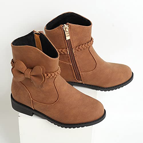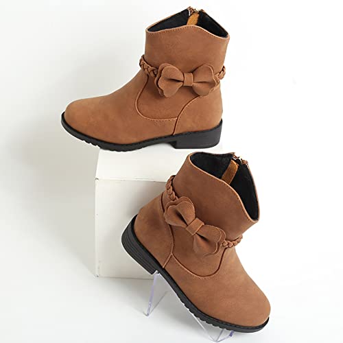 HOT ! Girls Bow Decor Side Zip Western Boots Kids Ankle Boots Girls Low Heel Riding Booties with Zipper Girls Dress Booties (Brown, 7-8 Years)