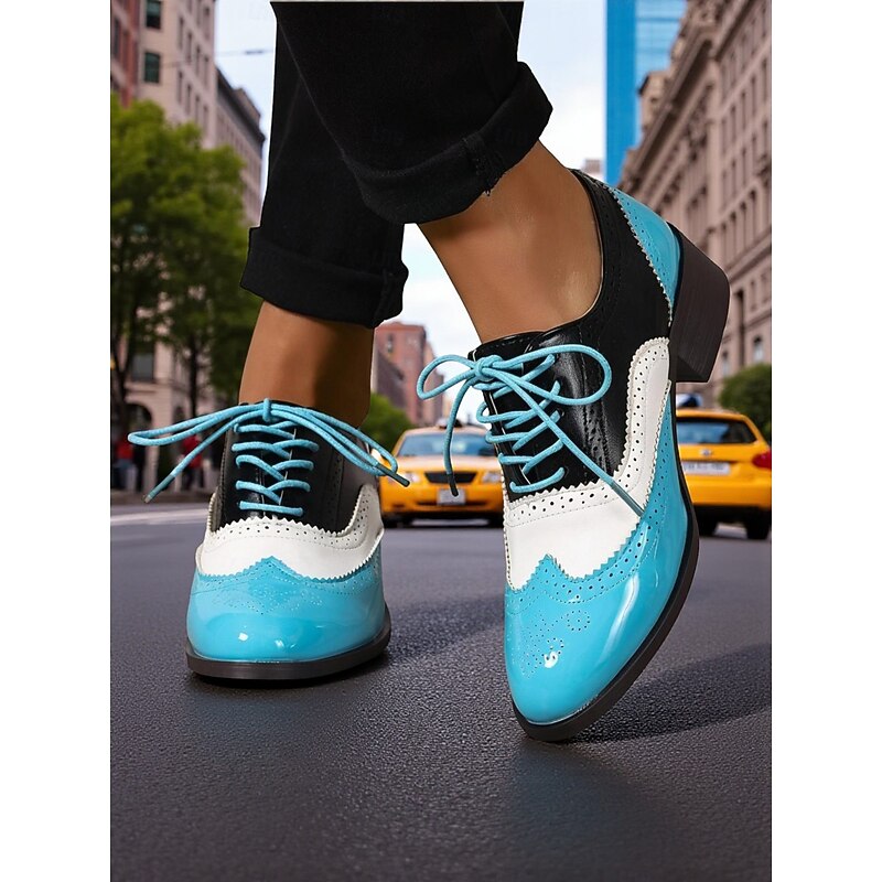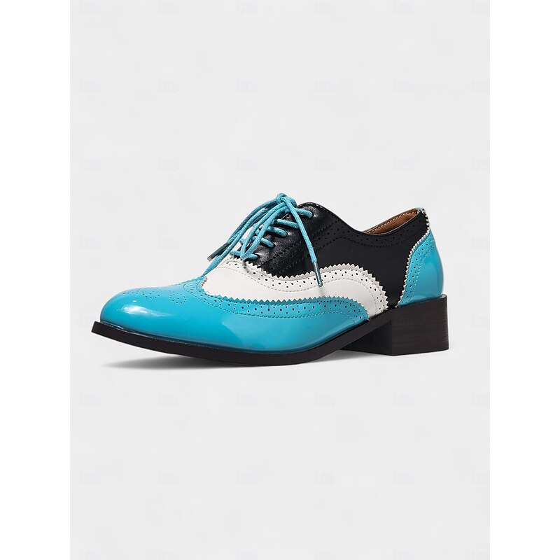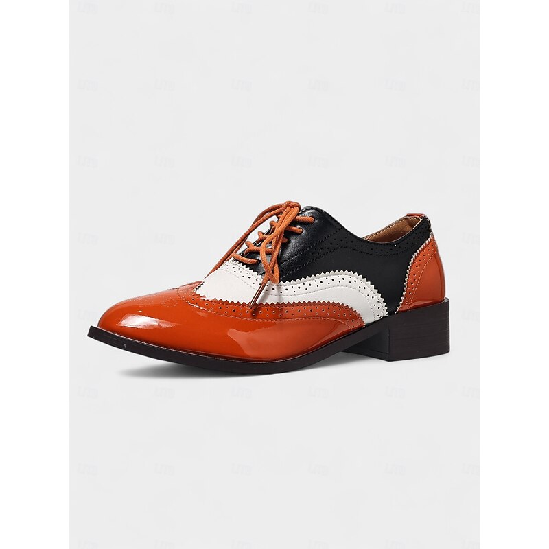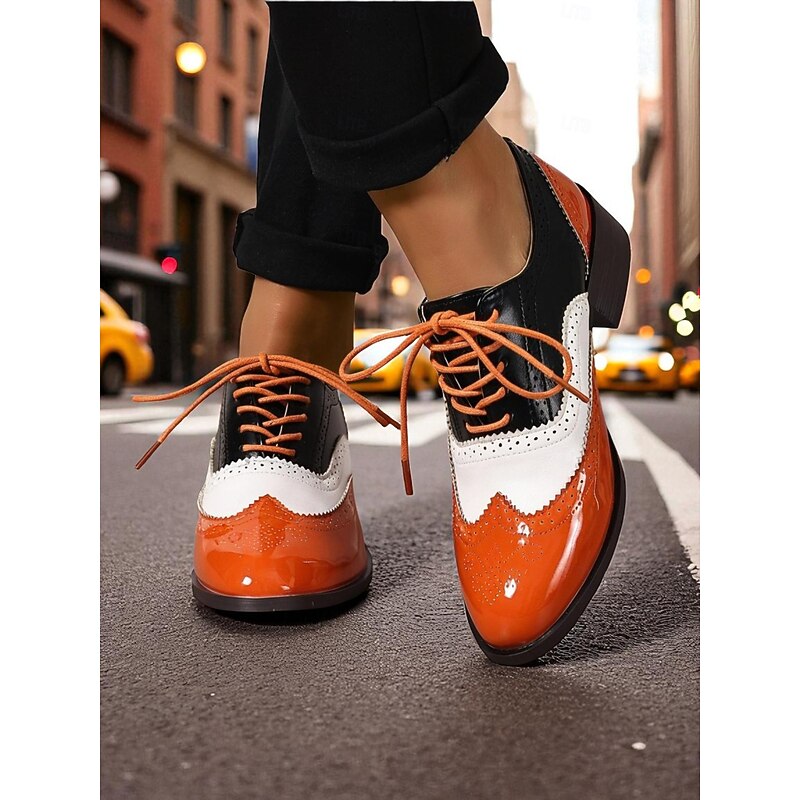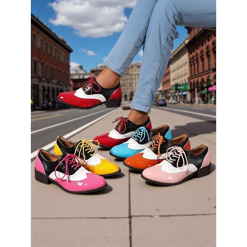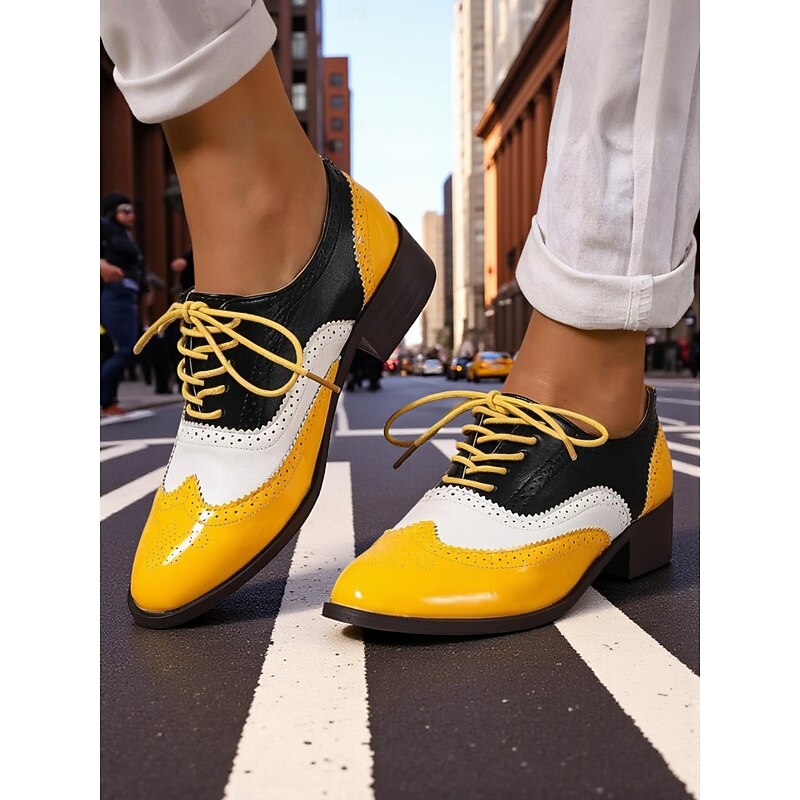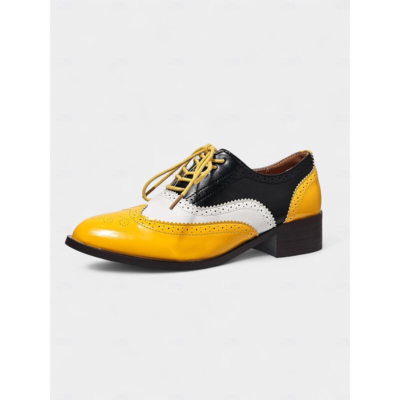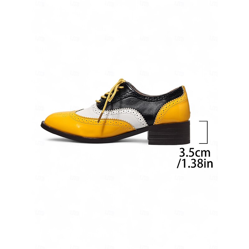HOT ! Women's Yellow Patent Leather Oxford Brogues – Colorblock Wingtip Lace-Up Dress Shoes, 1950s Vintage British Style for Office, School and Streetwear