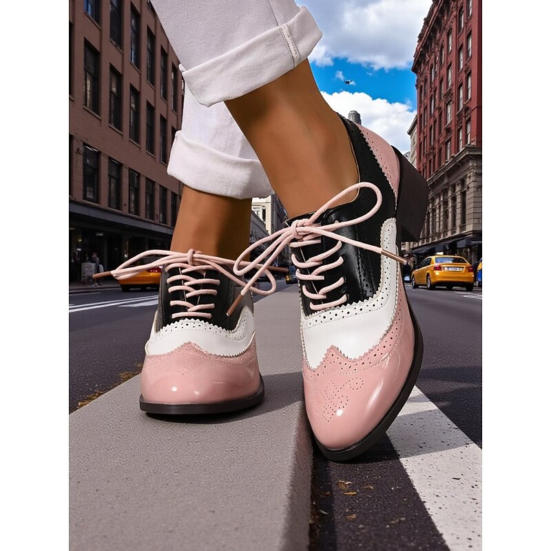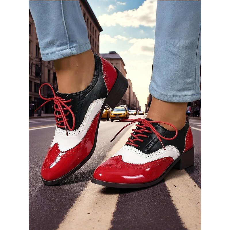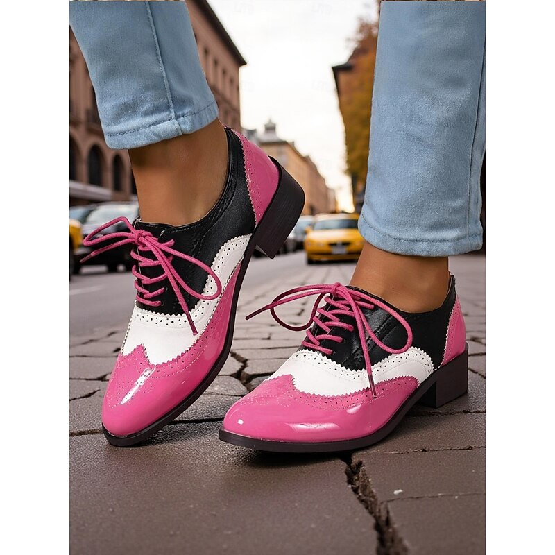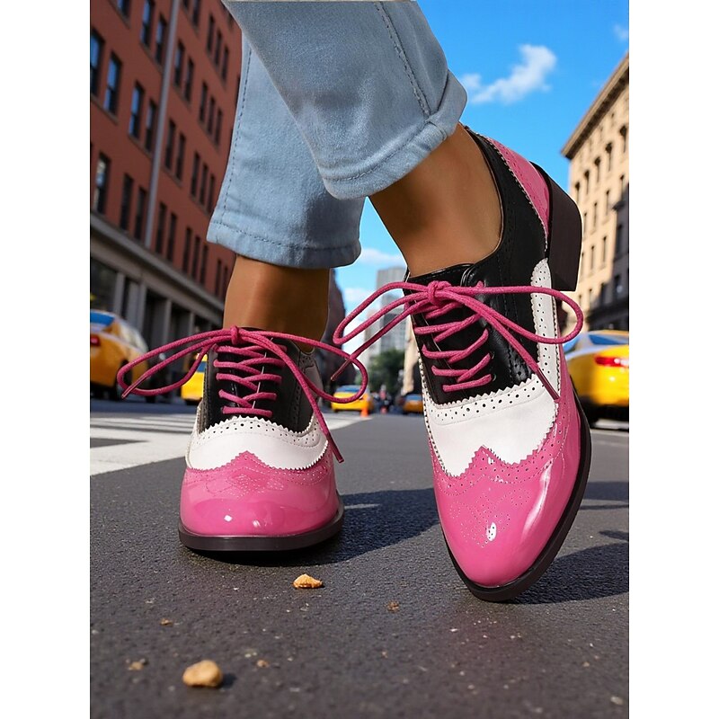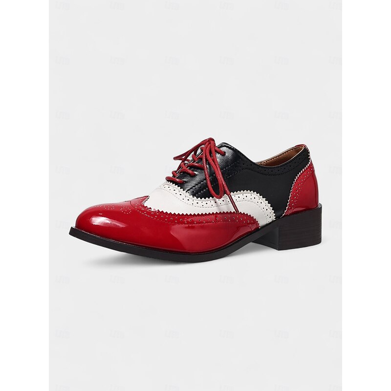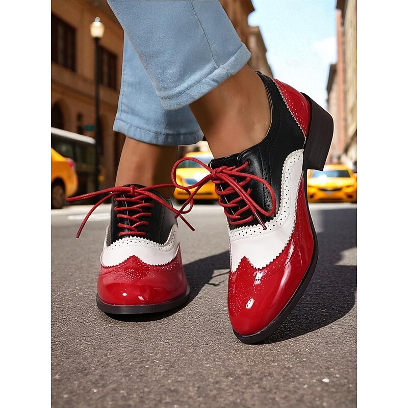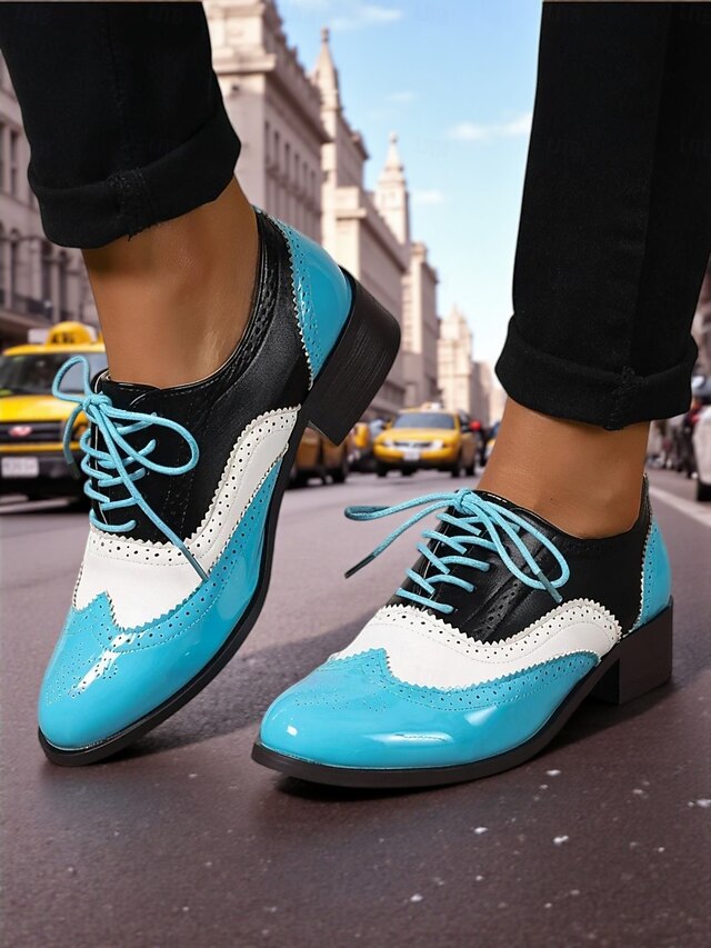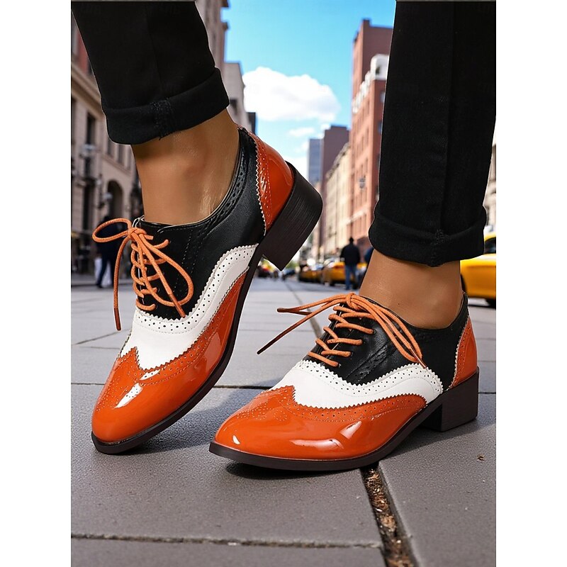 HOT ! Women's Yellow Patent Leather Oxford Brogues – Colorblock Wingtip Lace-Up Dress Shoes, 1950s Vintage British Style for Office, School and Streetwear