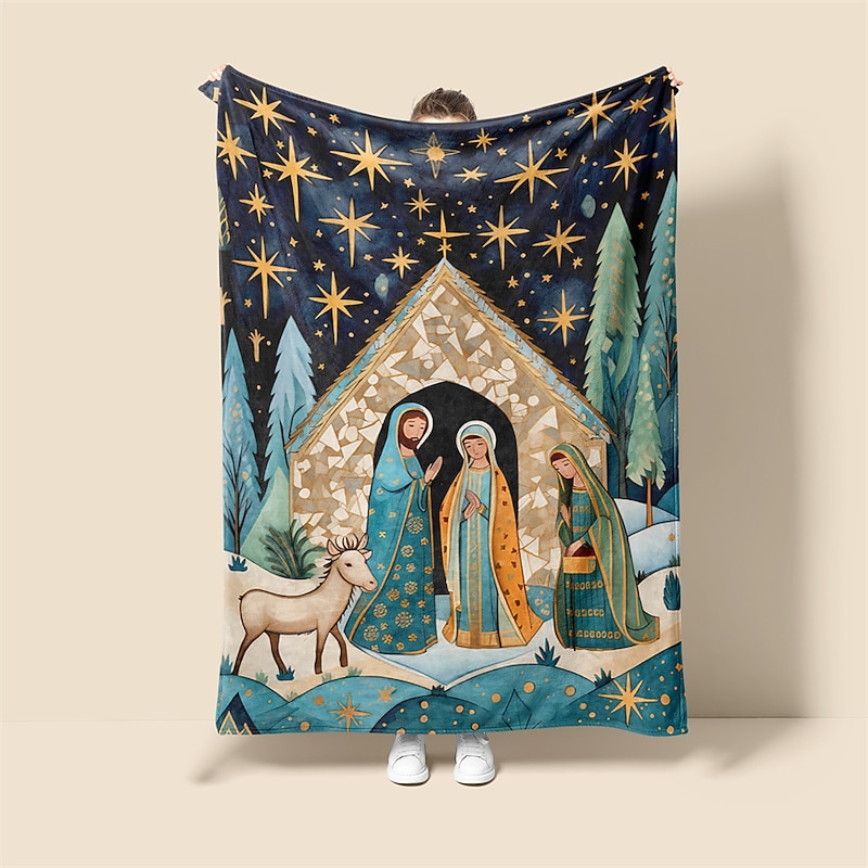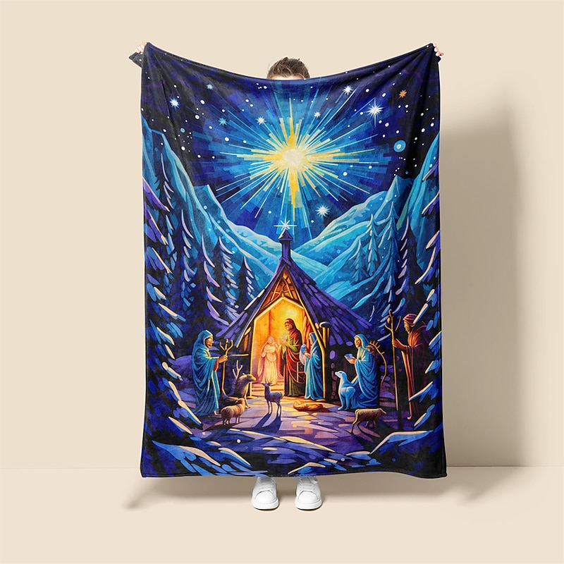 Highlights [Material and Texture]: Crafted from high-quality flannel and polyester, this vintage-style throw blanket offers a soft, plush texture that ensures warmth and comfort throughout all seasons. The fabric’s rich feel makes it a cozy addition to any living space, perfect for snuggling up during the festive holidays. [Design and Style]: The blanket is beautifully designed with an intricate nativity scene depicting Mary, Joseph, and the baby Jesus, along with shepherds and animals, capturing the essence of the traditional Christmas story. Vibrant colors such as deep blues and warm earth tones, highlighted subtly with gold, enhance the festive theme. The border features star patterns, adding to its decorative appeal. [Design Highlights]: The craftsmanship of the blanket is evident in its detailed nativity depiction, showcasing artistry that makes it an eye-catching piece of home decor. The use of reactive printing technology ensures vivid and long-lasting colors that bring the scene to life. [Occasions]: Ideal for adding a touch of warmth and charm to your home during the holiday season, this blanket makes a thoughtful gift or can be used as a decorative accent piece on your couch or bed. Its stylish design fits perfectly with festive celebrations and cozy winter evenings. [Size Range]: Available in three generous sizes—100x130cm (39x51in), 130x150cm (51x59in), and 150x200cm (59x79in)—the blanket offers versatility, providing ample coverage for various uses, from lounging on the couch to adding an extra layer on the bed.