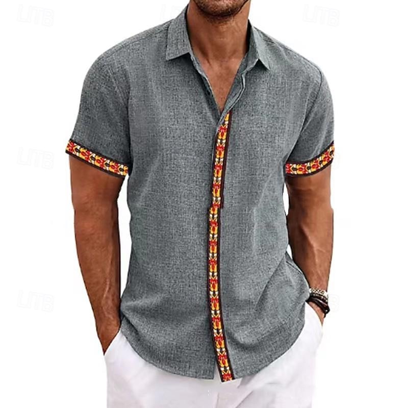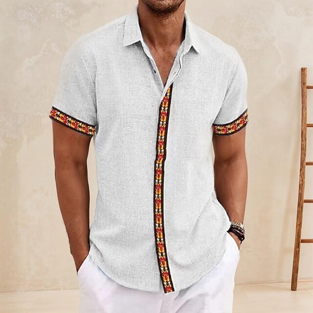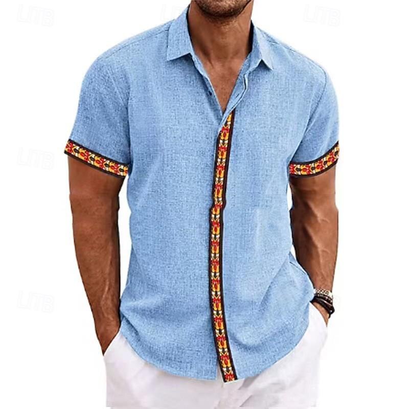 Highlights - Stay cool and stylish this summer with this men's linen shirt - Perfect for vacation and beach outings - Short sleeves for ultimate comfort - Features a trendy color block pattern - Classic turndown neckline adds a touch of sophistication