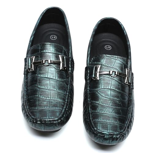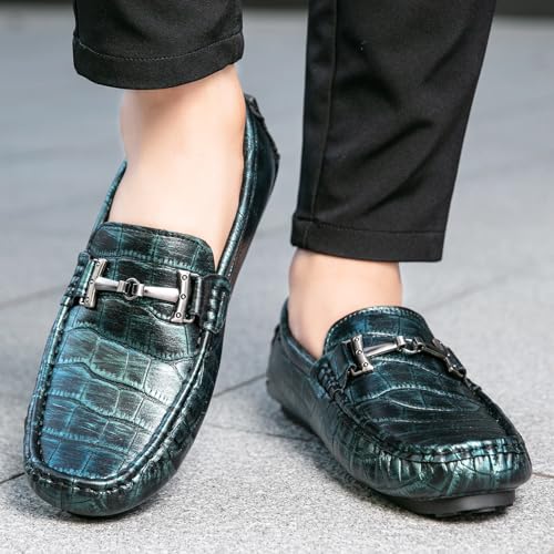 Men's Driving Loafers Casual Penny Loafers Metallic Leather Crocodile Pattern Slip-On Moccasins with Metal Buckle Soft Work Boat Shoes 7