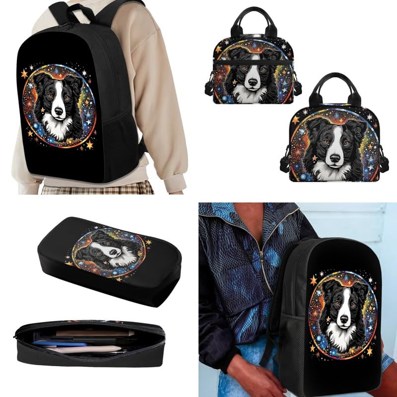 HOT ! Galaxy Border Collie Print 3 Pcs Shoulder Lunch Bag and Pen Case Bag Set Colorful Starry Sky Puppy Animal Dog Pattern Travel Backpack 17 Inch Student Backpack Bookbags Set