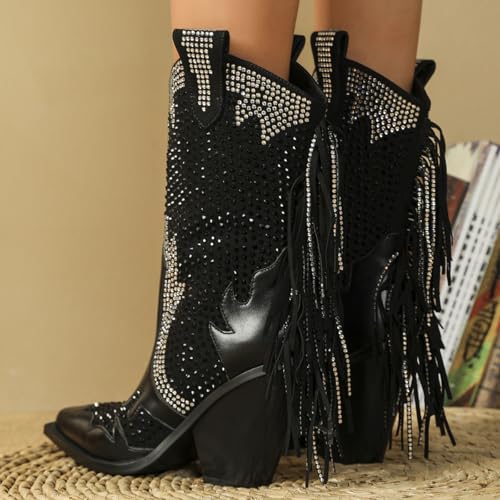Feinlina Women's Pointed Toe Chunky Heel Mid Wide Calf Boots Rhinestone Western Cowboy Boots With Tassel 6