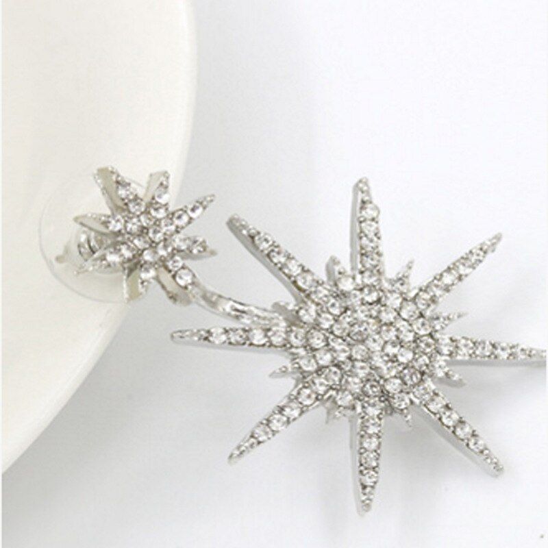 Highlights [Fabric] : Expertly crafted from high-quality alloy, these women's earrings feature a luxurious golden or silver finish. The lightweight metal ensures comfortable wear throughout the day, making them ideal for various occasions. [Structure] : Designed in a chic and modern style, these earrings boast a sophisticated star pattern that adds a touch of elegance to your ensemble. The large starburst design, embellished with shimmering rhinestones, captures and reflects light beautifully, creating a dazzling effect. [Design Highlights] : The standout feature of these earrings is their celestial-inspired starburst shape, complemented by smaller matching studs for a cohesive and glamorous look. The intricate rhinestone embellishments add texture and visual interest, making them a statement accessory for any outfit. [Occasions] : Perfect for weddings, parties, dates, and elegant evening gatherings, these earrings enhance both formal and casual outfits with their stylish and versatile design. Suitable for all seasons, they are an accessory for any wardrobe. [Size] : Available in one-size, these earrings are designed for women seeking a chic and modern piece that effortlessly elevates their style. The comfortable fit and timeless design make them an excellent choice for adding sparkle to your look year-round.
