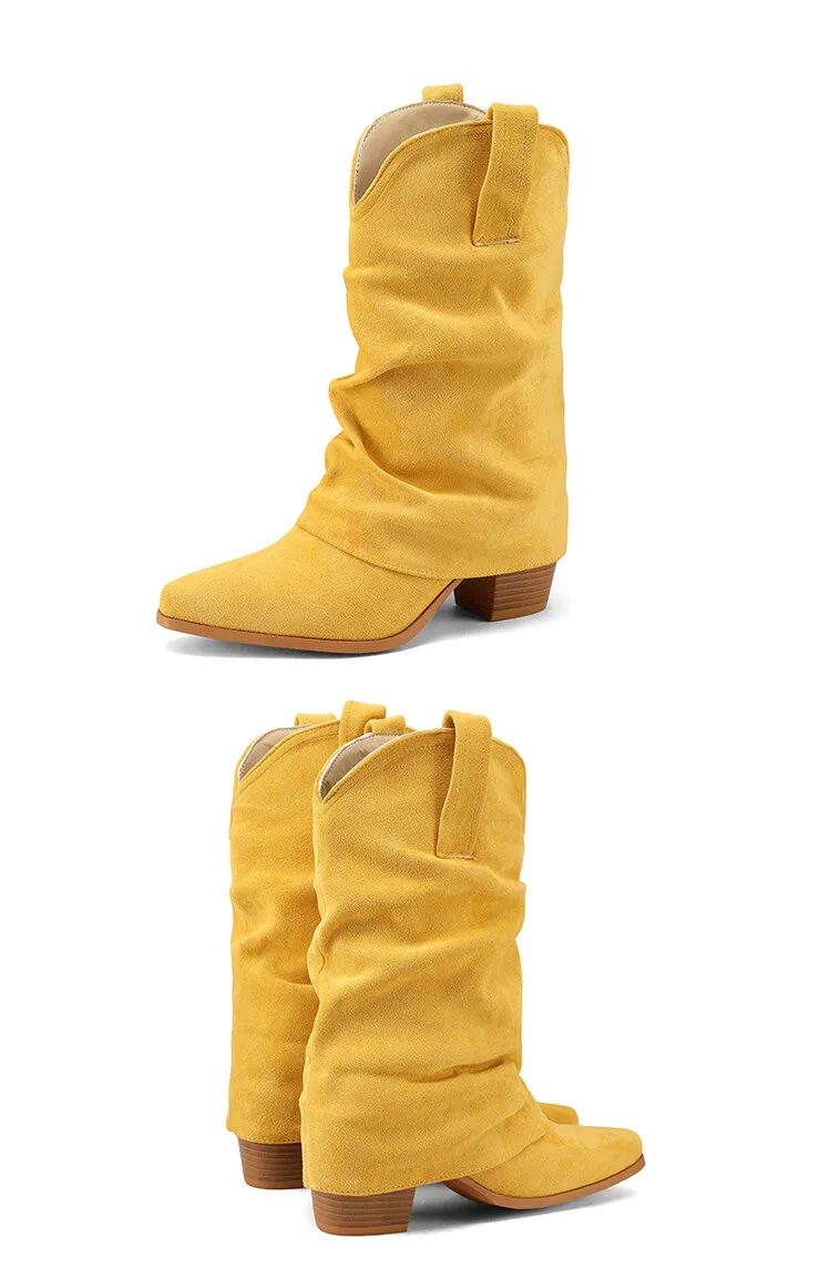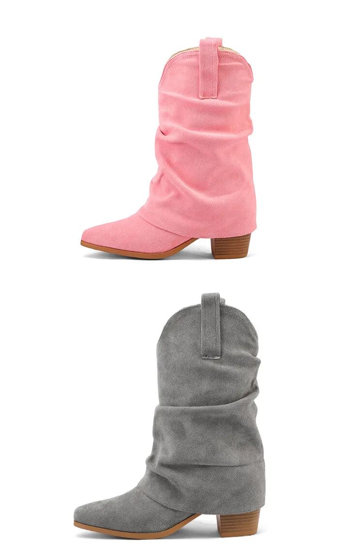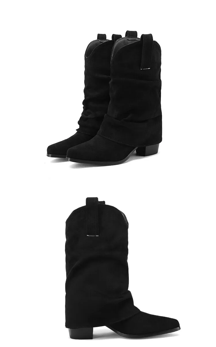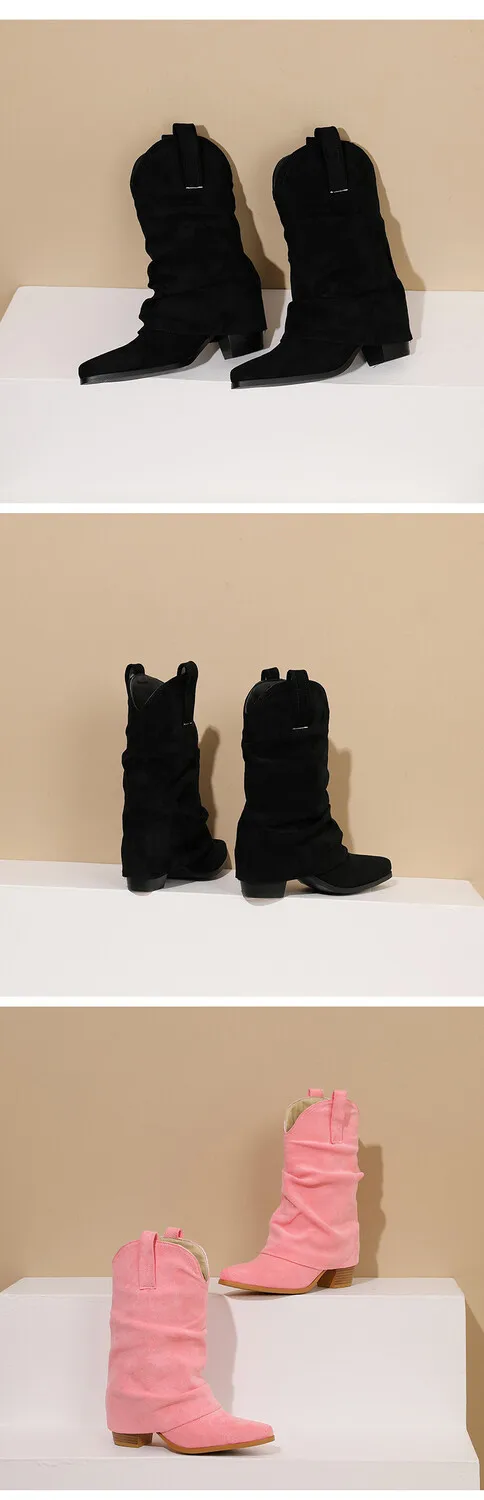 Suede 7cm Square Heel Pointed Pleated Mid Length Cowboy Boot Skirt Calf Boots 35-43