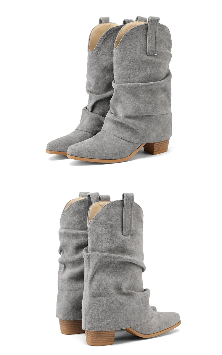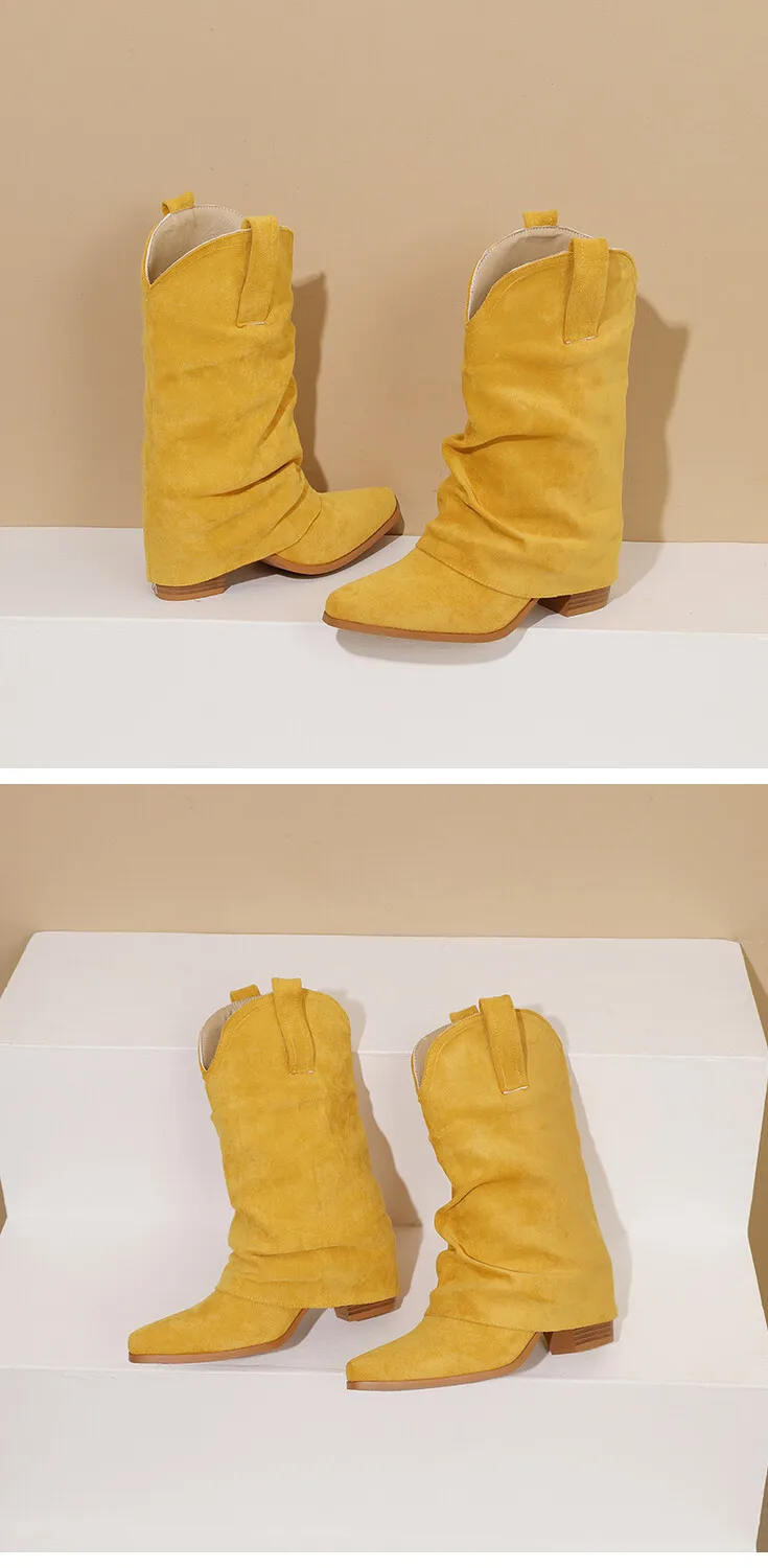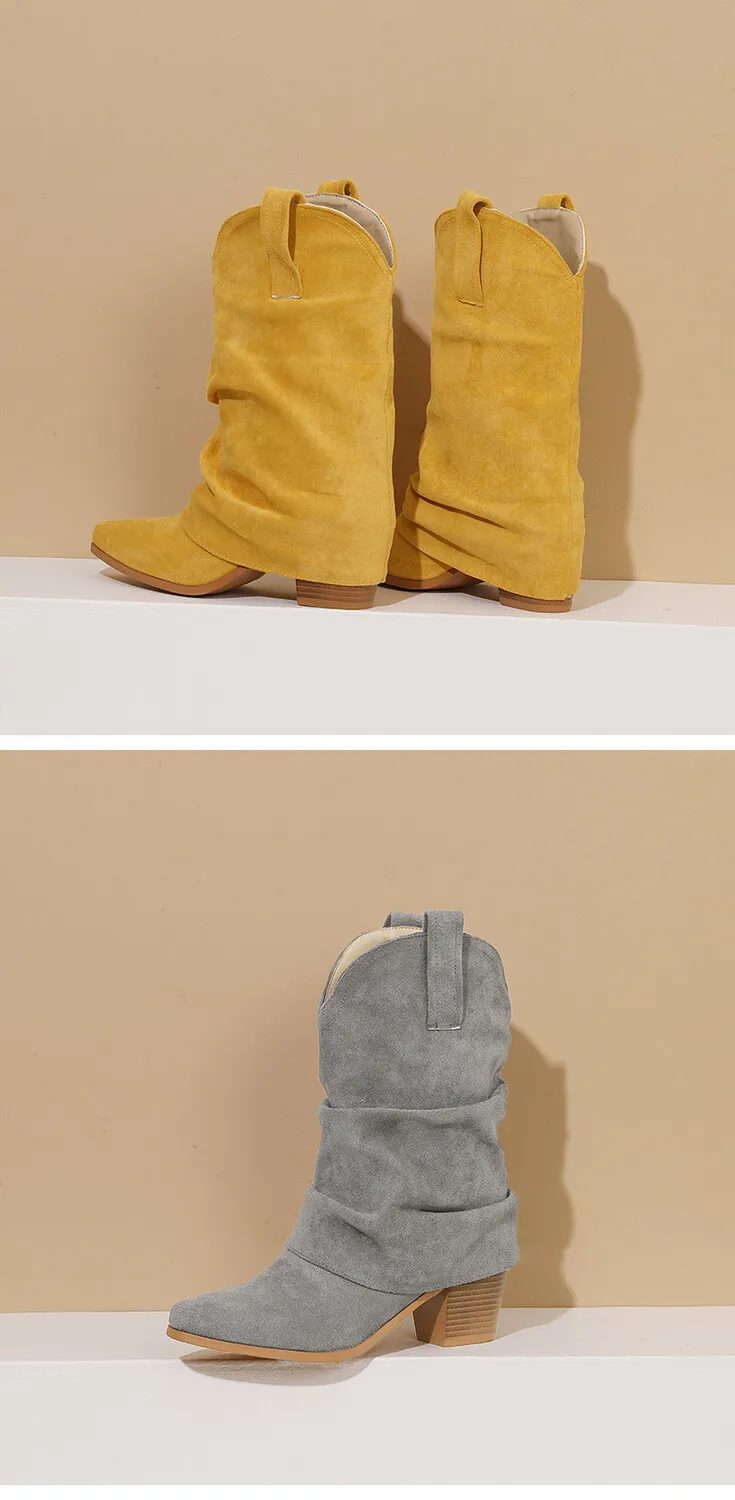 Suede 7cm Square Heel Pointed Pleated Mid Length Cowboy Boot Skirt Calf Boots 35-43