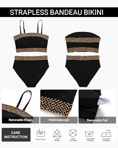 • Black Golden Bandeau Bikini Top:This two-piece swimsuit comes with adjustable shoulder straps and a detachable padded bra, providing good support. The multifunctional design allows you to choose between a cute style with shoulder straps or a sexy strapless appearance with just the straps removed