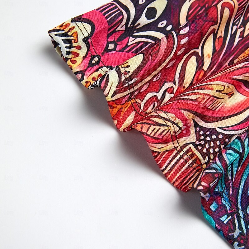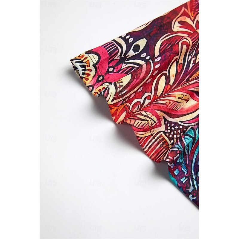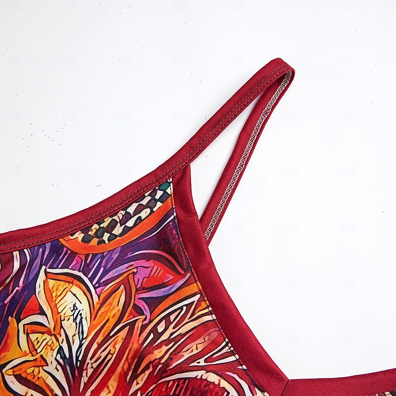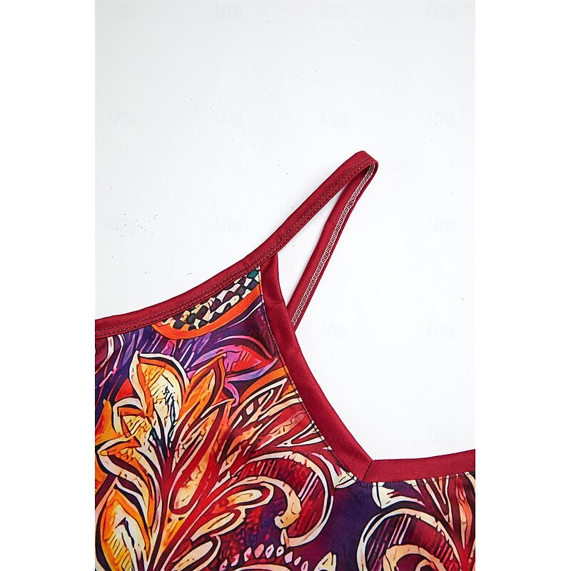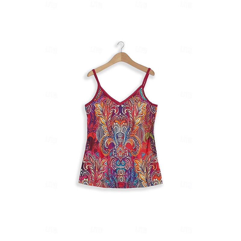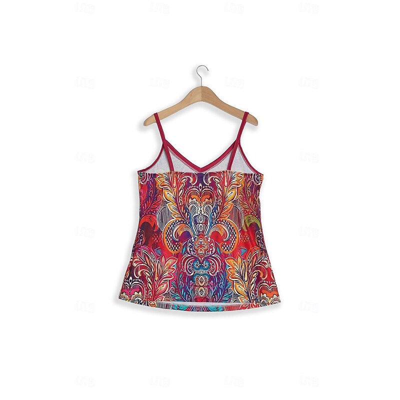 Highlights [Fabric]: Crafted from a lightweight blend of polyester and spandex, this sleeveless tank top offers both comfort and a flattering drape. The micro-elasticity of the fabric ensures a comfortable fit that moves with you. [Fit]: Designed with a regular fit, this camisole provides a relaxed and easy-going silhouette, perfect for casual summer wear. [Design Highlights]: The top boasts a vibrant abstract floral pattern with a 3D graphic print. It features a stylish V-neckline paired with contrasting thick straps for added security. The bohemian red paisley and vintage graphic print give it a unique ethnic flair. [Occasions]: Ideal for vacations and casual outings, this colorful tank top is a standout choice for warm weather events. Pair it with jeans or shorts for a chic and bohemian look that suits a variety of casual occasions. [Size Range]: Available in a range of sizes from S to 2XL, this top offers versatile sizing to accommodate different body types.