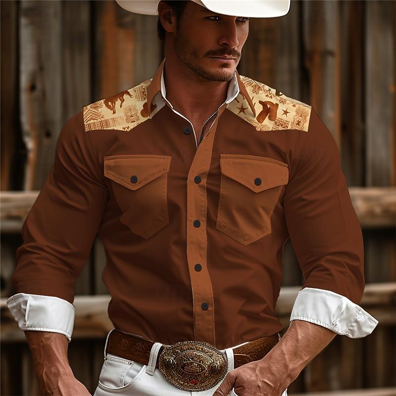 More information about Men's Aztec Tribal Ethnic Western Shirt Cowboy Shirt Long Sleeve Vintage Western Style Daily Wear Going out Weekend Spring & Summer Turndown Pocket Print Button-Down Navy Blue Brown Coffee