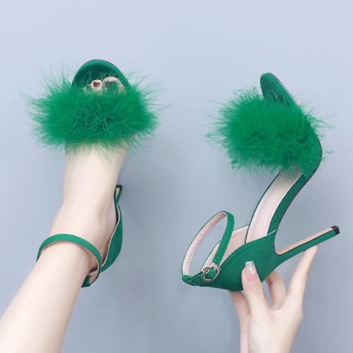 4.15 Inches Women's Ankle Strap Fluffy Feather Ankle Strap Stiletto Heels Sandals Open Toe Party Evening High Heel Pump Shoes 5