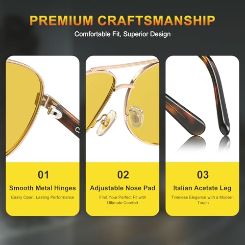 • Lightweight and Comfortable: Built with a gold metal frame and Italian acetate temples, these night time glasses are both durable and lightweight. The ergonomic design ensures comfort for extended wear, with flexible temples and silicone nose pads that provide a secure and personalized fit without discomfort.