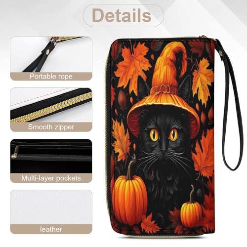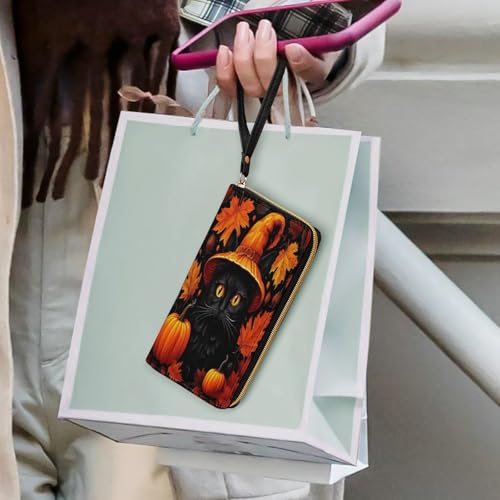 HOT ! Halloween Black Cat Women's Wallet Wristlet Zipper Purse with Hand Strap Travel Credit Card Holder for Daily Use Gifts