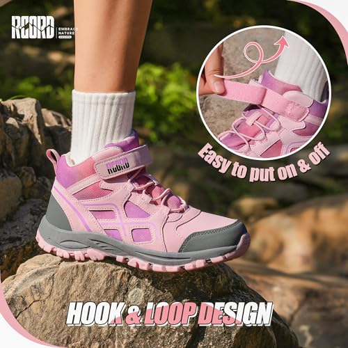 R CORD Kids Hiking Boots Waterproof Girls Hiking Boots Durable TPR Traction Outsole Girls Hiking Shoes Anti-Skid Athletic Hook and Loop Closure Kids Hiking Shoes for Outdoor 1