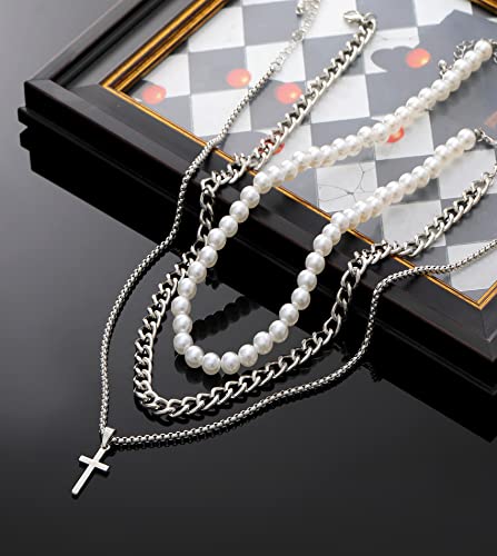 Pearl Necklace for Men Layered Cuban Link Cross Necklaces Mens Stainless Steel Chain Faux Pearl Choker Compass Pendant 3PCS Necklaces Set for Men Women Jewelry Gift 3