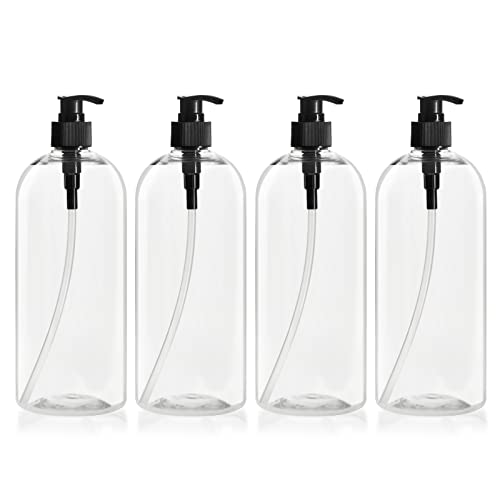 Okuna Outpost Empty Refillable Shampoo & Conditioner Pump Bottles - 34 Oz Clear Plastic with Black Pumps - 4 Pack Non-Spill Dispensers - Minimizes Waste & Refillable for Body Wash, Hand Soap & Lotion 4