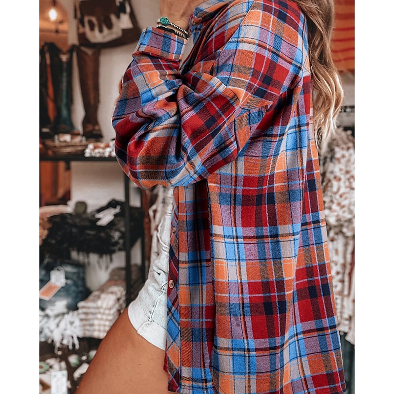 Women's Shirt Blouse Plaid Modern Casual Long Sleeve Shirt Collar Regular Tops Daily Holiday Going out Pocket Buttons Red Blue Fall 7
