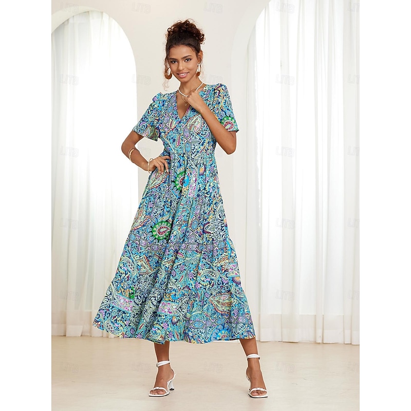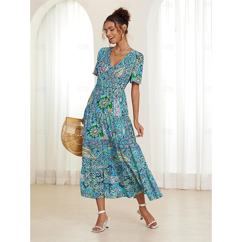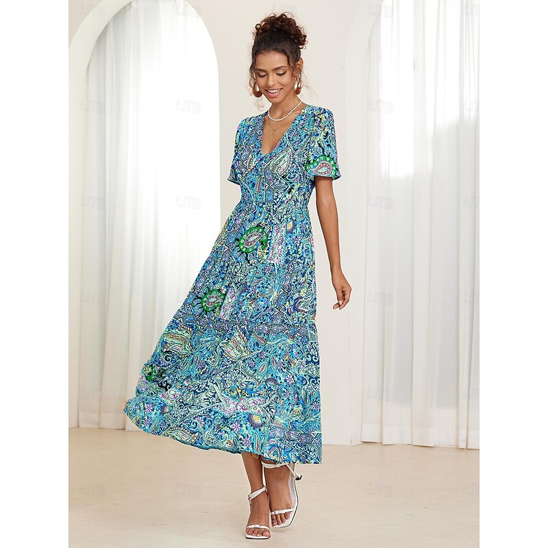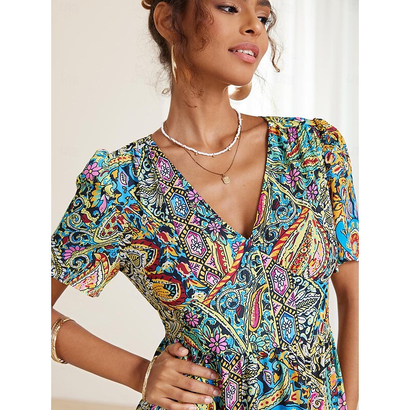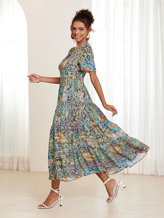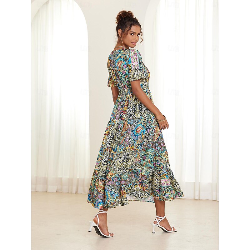 Women's Midi Boho Dress V-Neck Short Sleeve Paisley Print Flared Summer Casual Lightweight Breathable Fabric Colorful Bohemian Style Vacation Beachwear Multicolor Available in Multiple Sizes