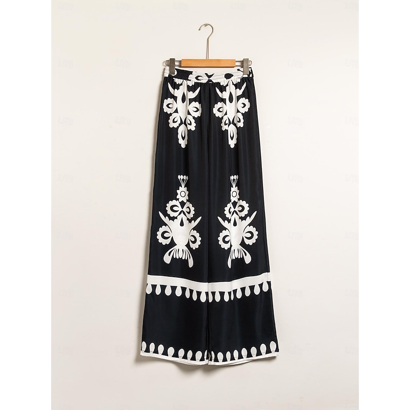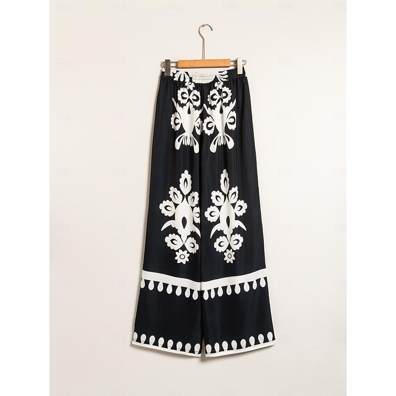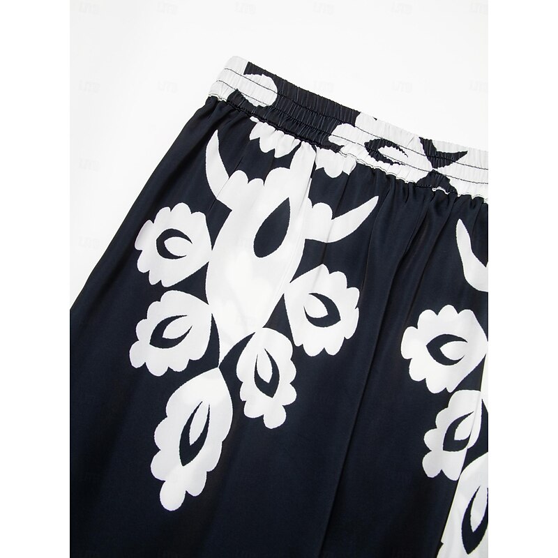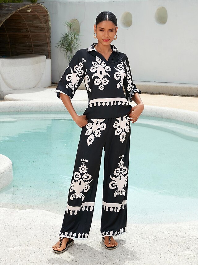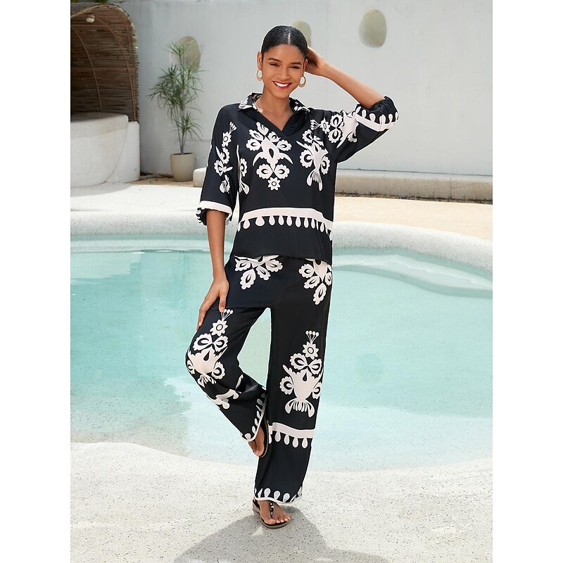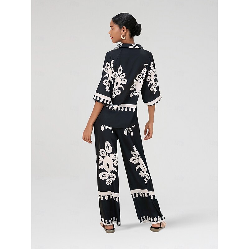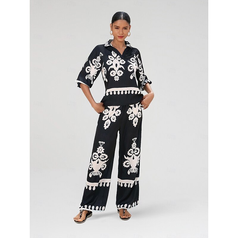 HOT ! Satin Classic Print Lapel Straight Shirt Set