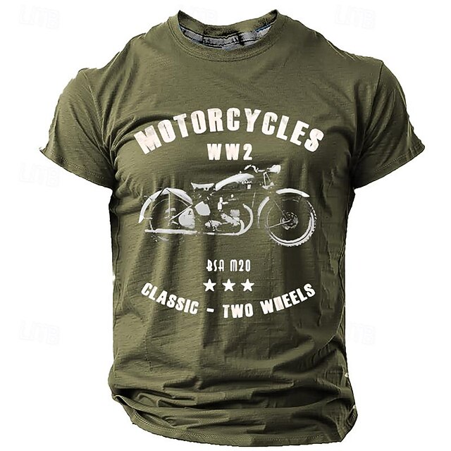Highlights [Fabric] : Crafted from a durable polyester material, this men's t-shirt offers a blend of comfort and resilience. It's lightweight and breathable, making it ideal for spring and summer wear. [Fit] : The t-shirt features a regular fit with a classic crew neck and short sleeves, providing a relaxed silhouette that pairs easily with both jeans and shorts for a casual, yet stylish look. [Design Highlights] : The standout feature of this t-shirt is its 3D print design inspired by World War II motorcycles. The front showcases a bold graphic with text that reads "MOTORCYCLES WW2," "CLASSIC - TWO WHEELS," and "BSA M20," giving it a distinctive retro vintage touch. [Occasions] : Perfect for outdoor sports, holiday adventures, or casual outings, this versatile t-shirt adds a touch of designer flair to everyday activities. Whether you're going for a laid-back stroll or engaging in sports, it ensures style and comfort. [Size Range] : Available in a wide range of sizes from S to 3XL, catering to various body types and preferences, ensuring you find the perfect fit for your style needs.